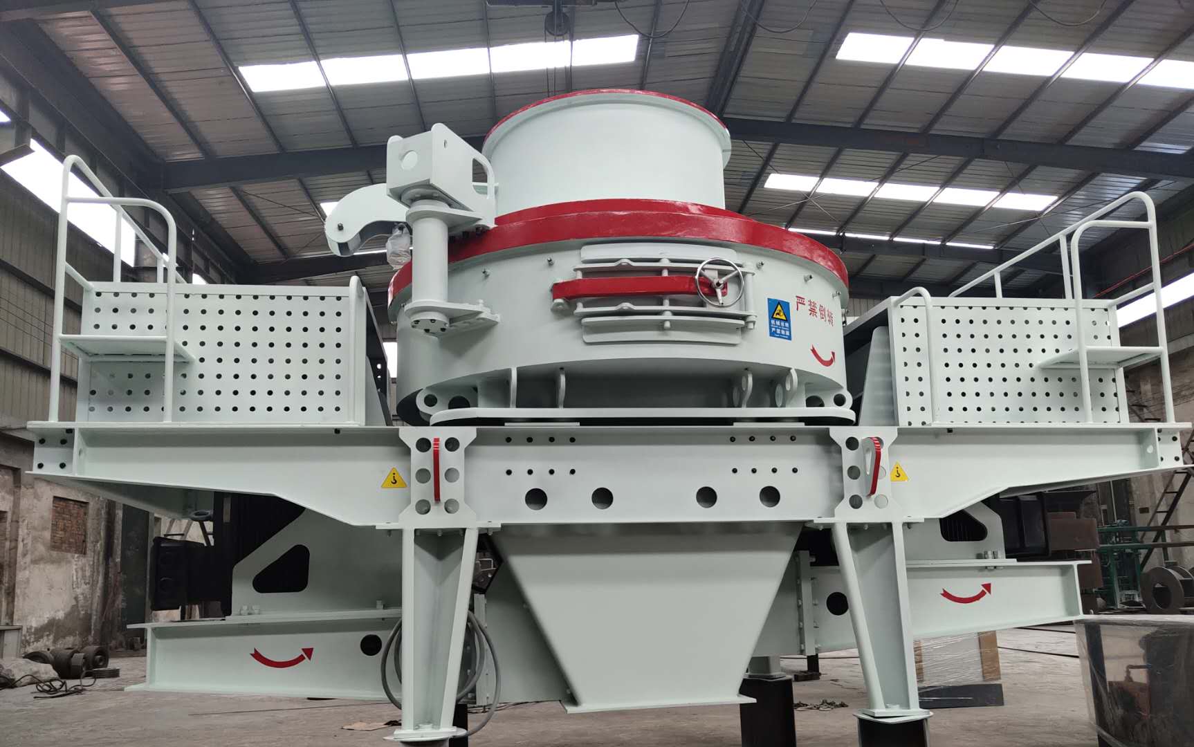 安裝時(shí)應(yīng)將沖擊式制沙機(jī)調(diào)平使其主軸與水平面垂直。碎石機(jī)上方應(yīng)設(shè)置起吊設(shè)備,起吊設(shè)備能力按制沙機(jī)重量考慮,在制沙機(jī)上方應(yīng)留有起吊空間,在制沙機(jī)一側(cè)留適當(dāng)空間,以備檢修時(shí)用。